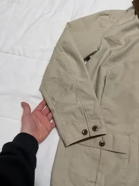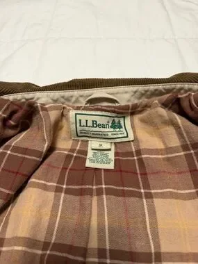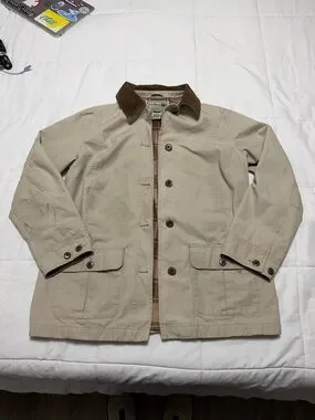 Stylish beige field jacket by L.L. Bean. Features a brown collar and button closure. Ideal for outdoor adventures. Has stains as pictured