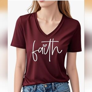 Soft V-neck women's top with a white "faith" script print. Comfortable, lightweight fabric for everyday wear. Burgundy color adds warm, versatile style. Easy to pair with jeans or skirts.