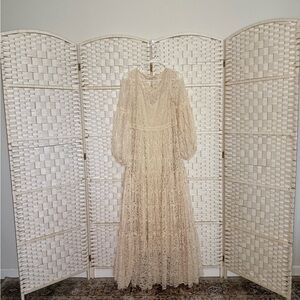 Elegant cream lace maxi dress with long balloon sleeves. Lightweight layered skirt creates soft movement. Feminine high neckline and intricate lace detailing for a romantic look. Perfect for special occasions, photoshoots, and styled events.