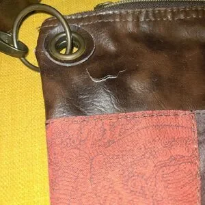 The bag has a faux leather brown removable and adjustable strap and bronze hardware.