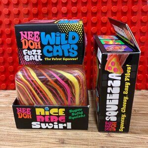 Brand New NEEDOH's! Trio comes with orange/pink/yellow Nice Berg Swirl, PINK Fuzz Ball WILD CAT, Squeezza pizza with yellow cheese-orange pepperoni-pink crust! Happy to help you complete your collection!