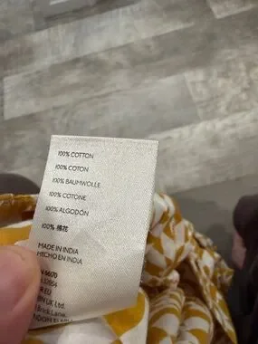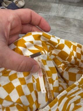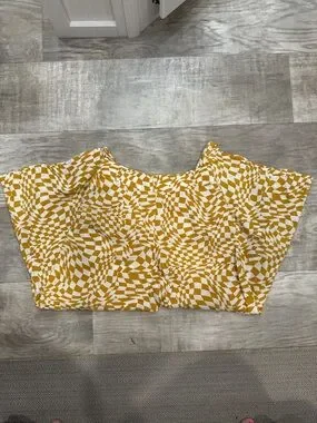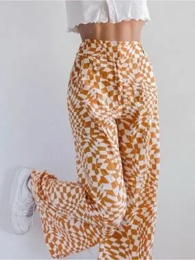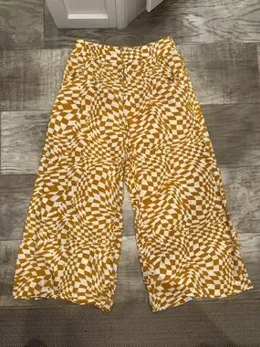 Stylish wide leg pants. Eye-catching yellow and white pattern. Comfortable and trendy.