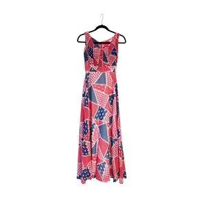 Love maximalist 60’s/70’s True Vintage? Don’t sleep on this incredible two-piece bohemian maxi sundress in red, white, and blue with a matching shawl. Epic patchwork pattern that is perfectly representative of the hippie era. The dress is sleeveless, with a high waist and stretch at the bust. Zips in the back. Perfect for festivals, events, parties, photo shoots, and more. Fits size xs.
