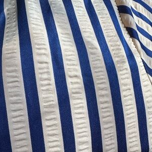 Bold royal and white/cream stripes. Button-front placket. Short puff sleeves. Relaxed, easy silhouette.