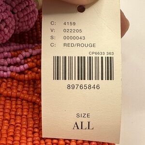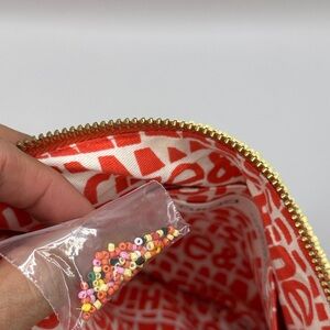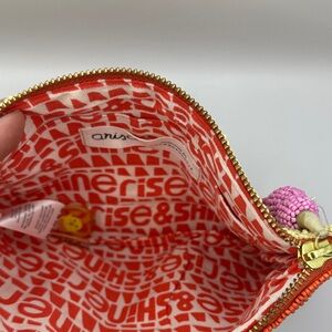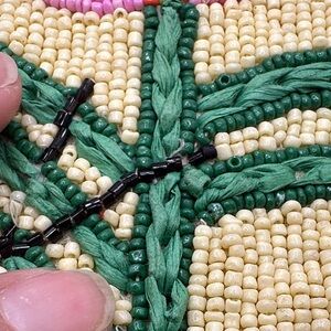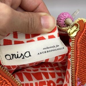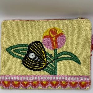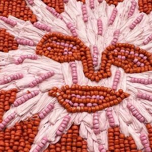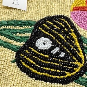 This beaded top-zip pouch is a standout piece from the Anisa Makhoul x Anthropologie collection. Handcrafted from paper raffia and richly adorned with vibrant glass seed beads, each pouch reflects Makhoul’s signature style—joyful, colorful, and inspired by nature. The front features a vibrant beaded floral and butterfly motif, while the reverse features her uplifting "Tu es le soleil" (“you are the sun”) motif. Originally sold exclusively at Anthropologie and priced at $78, these are now limited collector items