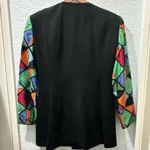 The Vintage Pierre Balmain Paris Black Multicolor Jacket in size 6 is a stylish and unique piece perfect for various occasions. Featuring a long length, mosaic kind of long sleeves, and a colorful button closure, this jacket boasts a geometric pattern with glitter, sequin, and button accents for added flair. Really unique! The lightweight and breathable design make it suitable for all seasons, while the vintage charm adds a touch of nostalgia to any outfit. Perfect for those who appreciate classic fashion with a modern twist, this Balmain jacket is a timeless piece that will elevate any wardrobe.