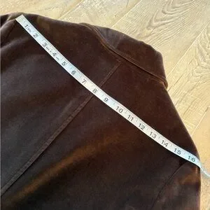 velvet belted blazer in rich brown. Tailored silhouette with notch lapel, front buttons, and a matching velvet belt. Soft velvet finish offers a polished, luxurious look for day or evening. Versatile brown hue that pairs easily with neutral and warm tones.