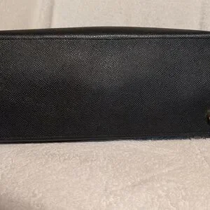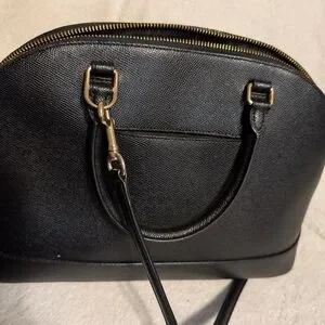 Elegant Coach black leather satchel with gold-tone hardware. Smooth pebble-grain leather for a polished look. Structured silhouette that holds essentials securely. Versatile black color pairs with any outfit.