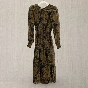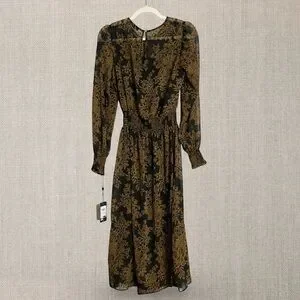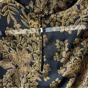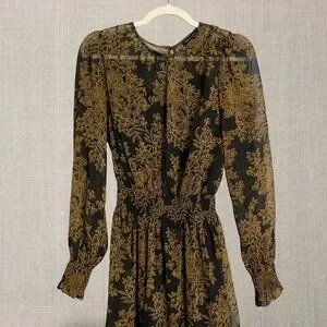 Long sleeve sheer black dress with gold/brown florals and black liner