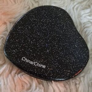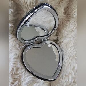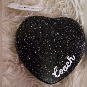 Coach Black heart-shaped dual compact mirror with glitter design and silvertone hardware in new giftable condition no use or callouts has tags attached. Measures 2.25 inches by 2.25 inches. Glitter black with white logo. Sleek metallic design, makes a perfect gift! Ships from smoke-free and pet free home.