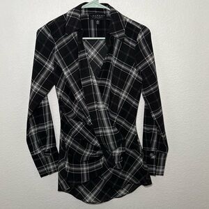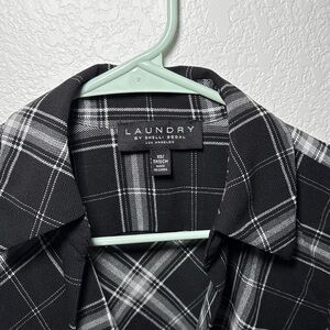 Laundry by Shelli Segal plaid blouse. Black and white twist-front detail. Long sleeves with button cuffs. Lightweight, polished look. Size: xs