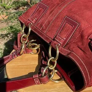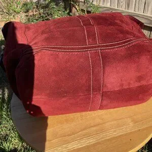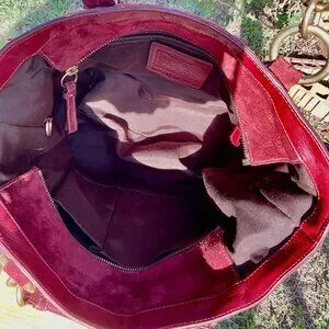 This stylish deep red (almost burgundy) suede and leather bag is perfect for any occasion. Its elegant design and vibrant color make it a standout accessory. Brown interior with several interior pockets. Measurements: Width: 13”, Height: 11”, Depth: 5.5”, Drop: 8”
