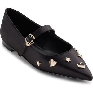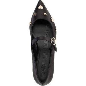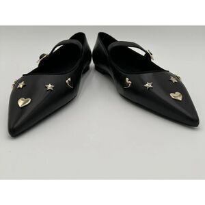New without box Karl Lagerfeld Paris Veyda Mary Jane flats. These stylish black leather flats feature a pointed toe with fun gold-tone heart and star studs, and an adjustable buckle strap. A perfect blend of classic style with a modern, playful twist.