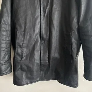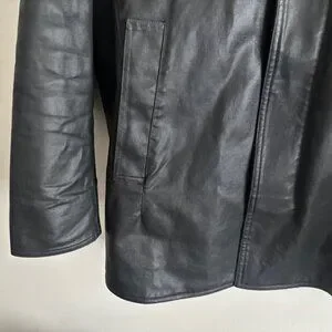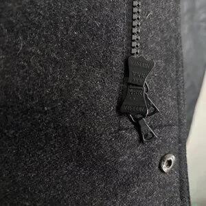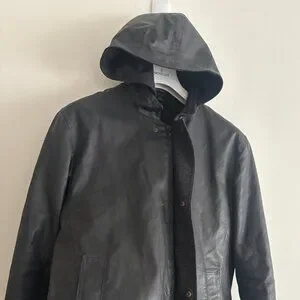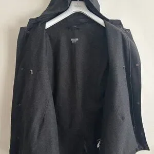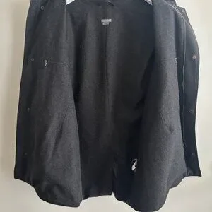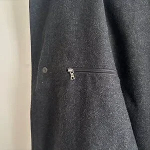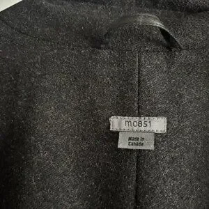 Black jacket from M0851, made in Canada. Features 2 way zippers with a snap button storrm flap , hood, w waist pockets and one internal zippered pocket. Warm wool lining. The material is a cotton polyurethane blend that is treated to be water resistant, feels similar to waxed cotton. $600 new.