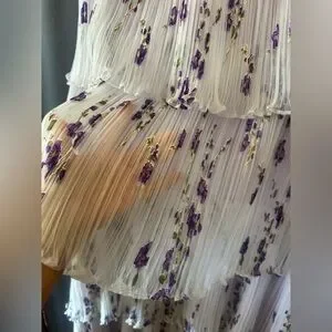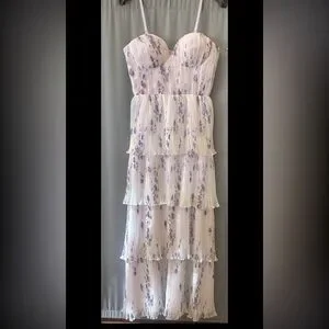 Elegant strapless maxi with tiered ruffle skirt. Soft lavender fabric with delicate floral print. Fitted bodice with sweetheart neckline. Flowing silhouette for formal occasions.