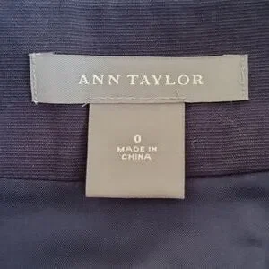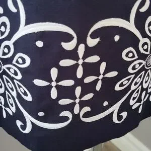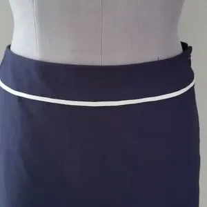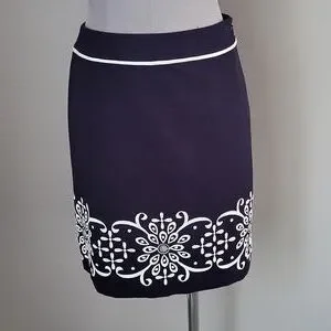 Elegant Ann Taylor skirt in a deep midnight blue. Features a tailored straight silhouette with a crisp white trim at the waist and bold embroidered white floral pattern along the hemline. A versatile piece that transitions effortlessly from work to evening wear. Fully lined with a side zip closure for a polished finish.