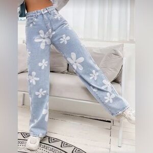 Stylish light blue jeans with a playful floral design. Perfect for adding a touch of fun to your wardrobe.