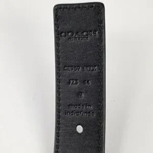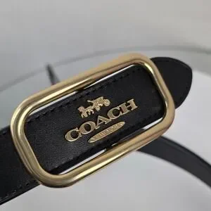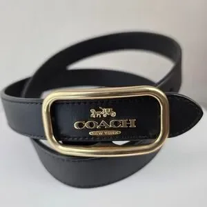 Coach Morgan Rectangle Buckle belt offers a timeless aesthetic with its smooth black leather construction and signature gold-tone horse and carriage logo. This versatile accessory features a sleek rectangular frame buckle with a peg-in-hole closure, making it an ideal choice for cinching dresses or elevating denim. The interior is stamped with the brand's heritage logo and model details, ensuring authentic luxury craftsmanship.