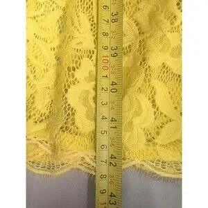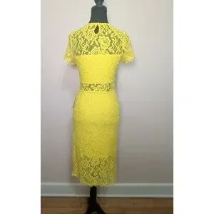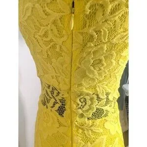 The Nordstrom Women's Size Xsmall Bright Yellow Lace Midi Dress is a stylish and vibrant option for a party or cocktail event. This bodycon dress features a solid yellow color with intricate lace accents, making it perfect for the summer, fall, or spring seasons. The dress has a zip closure and short sleeves, offering both comfort and style. Made from a blend of polyester, nylon, and spandex, this dress is sure to flatter your figure and turn heads wherever you go.
