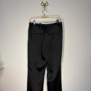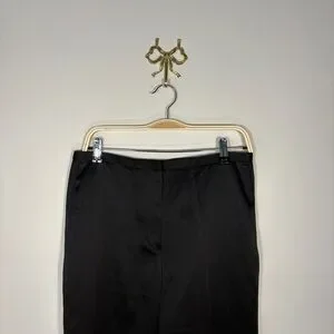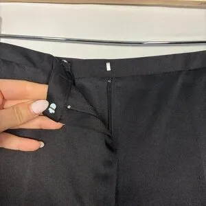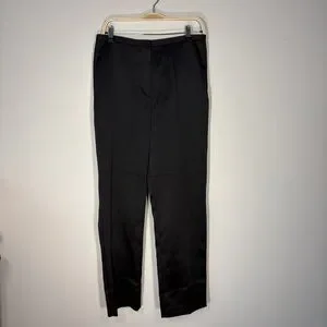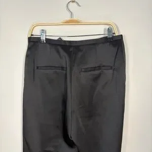 Elegant black satin-like dress pants with a sleek vintage-inspired waistband and timeless straight-leg silhouette. These have a beautiful subtle sheen that makes them perfect for evening wear, formal events, or elevated minimalist outfits.