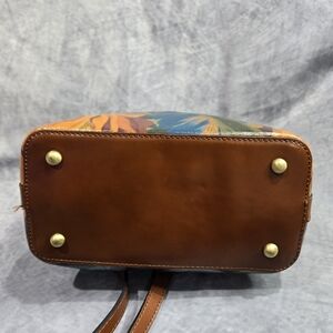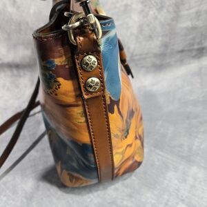 Patricia Nash Irving Bucket Handbag featuring the vibrant Marigold Harvest floral print on distressed leather.