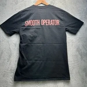 Classic band tee showcasing a bold graphic portrait of the iconic artist on the front and "Smooth Operator" text across the upper back. Crafted from a soft cotton blend in a versatile black wash, this short-sleeve crewneck offers a standard fit with a straight hem. The screen-printed graphics feature a vintage-inspired aesthetic, making it a perfect staple for fans of 80s soul and jazz-pop.