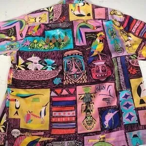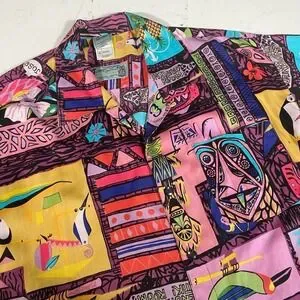 disney collectibles, tiki room, embroidered shirt, limited edition, vintage design, colorful print, tropical motif, novelty apparel, collector's item, themed graphic