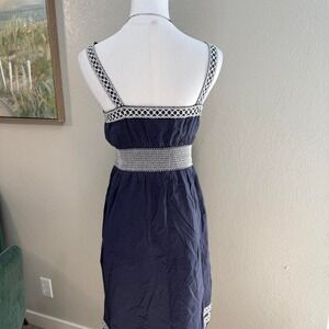 Cute navy sundress with white crochet trim + stretchy waist. Easy summer piece, super comfy. Great condition!