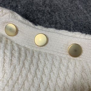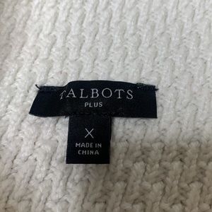Stylish color block turtleneck sweater by Talbots. Features white, beige, and tan sections. Cozy and elegant design.