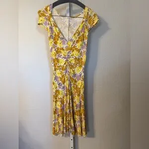 Free People Floral Ruched V Neck Midi Dress Yellow Purple XS
