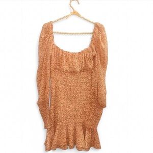 Delicate orange tan floral print dress with a feminine tie-front detail. Square neckline and soft ruffle trim. Lightweight fabric for breezy wear. Perfect for attending weddings, date nights or any special occasion.