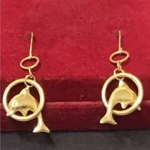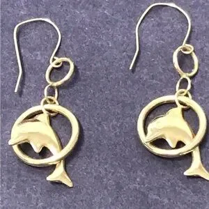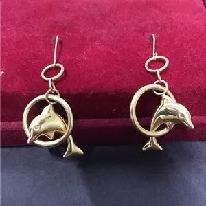 Elegant stamped 14k gold detailed dolphins 🐬jumping through hoops drop earrings.