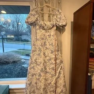 House of CB- Brand new with tag and pink ribbon. Elegant women's dress featuring a beautiful blue floral pattern on a white background. Perfect for any occasion.