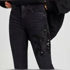 . Zara Women Premium Skinny Denim with Embroidered flower and Beads detail on Left Tigh