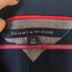 excellent condition Mens Classic Tommy Hilfiger V-neck cardigan. Navy knit with red contrast trim along placket and neckline. Front button closure with two front pockets. Small Tommy flag logo on chest. Lightweight, versatile layering piece. Preppy