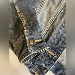 Lightly distressed denim jacket with brass colored buttons down the front and end sleeve cuffs.