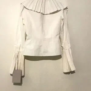This elegant white blouse features a sophisticated ruffled design, 2025 collection, Alexander McQueen