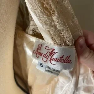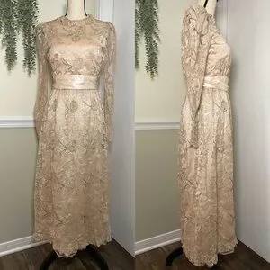 Vintage Rina Di Montella nude lace and sequin midi dress featuring stunning floral lacework, delicate sequins, and a sheer long-sleeve overlay. The satin waistband adds structure and highlights the waist, while the classic midi length creates an elegant and timeless silhouette. Perfect for formal events, weddings, cocktail parties, or collectors who love true vintage craftsmanship. Fully lined with a beautiful drape and intricate detailing throughout. Size 6 in a soft tan and cream palette.