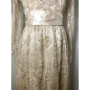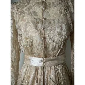 vintage lace dress, long sleeve, sequin detail, satin waist, midi length, floral lace, sheer overlay, modest fit, elegant formalwear, classic silhouette.