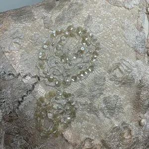 This dress is an absolute stunner and I am so sad to see it go from my collection but it deserves to be shown off! There are sequin and faux peal flowers throughout the dress. Slightly puffed shoulders.