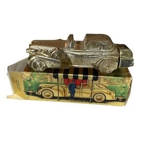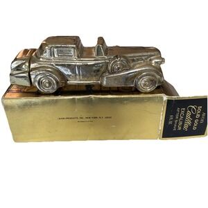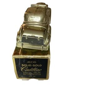 The Avon Solid Gold Cadillac Excalibur After Shave Cologne is a vintage collectible bottle that is almost full. This medium-sized glass bottle features a classic gold color with a shiny finish, perfect for any occasion. The bottle showcases a vehicle theme, specifically cars and vehicles, with a unique 1970s style. It comes boxed, making it a great addition to any collection of decorative collectibles from the late 20th century. This original piece from the United States is a must-have for any Cadillac or car enthusiast.
