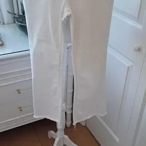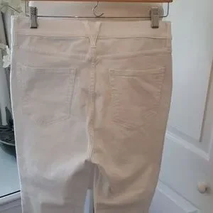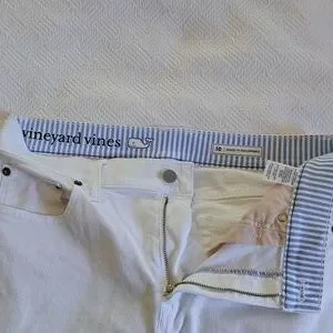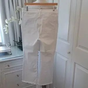 Trending preppy brand Vineyard Vines women's classic white stretch denim crop flare jeans with raw hems and zipper/button front. Pre-owned and in very gently used condition. Very faint marks on back right leg. Hardly noticeable. Please see pictures.