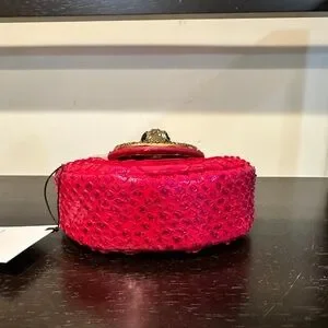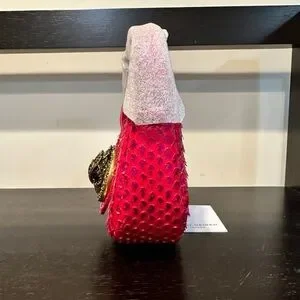 This Micro Chelsea Hobo bag is crafted from a metallic fuchsia 3D snake embossed leather. The front flap is adorned with an antiqued brass oval trim with eagle head at the centre embellished with crystals.