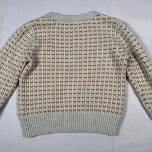 Madwell crewneck sweater blends a cozy merino wool and alpaca mix with a playful textured knit. The design features a neutral base with an all-over heart-like pattern and bold horizontal stripes in navy, pink, and mustard gold. Metallic gold thread accents add a subtle shimmer throughout the chest stripes. Finished with a classic ribbed neckline, cuffs, and hem, this piece offers a relaxed yet polished aesthetic.