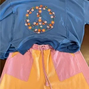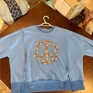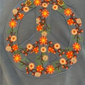 Easel Blue Top with Vibrant Floral Peace Sign Design