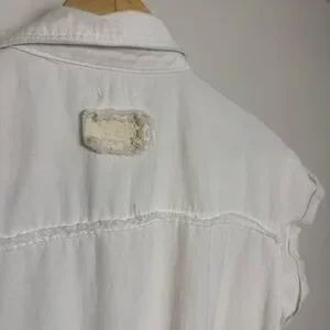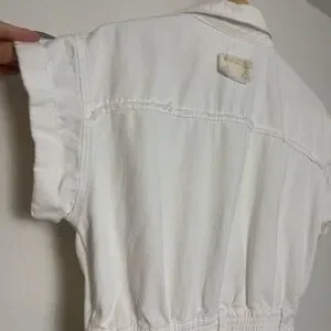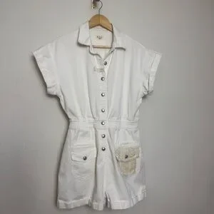POL White Button-Up Denim Romper. Women’s size small. Please see small stain above size tag. Rolled short and sleeves. Cuffed. Elastic waistband. Pockets. Western, bohemian, rodeo. Measurements laying flat are approximately Chest- 20 Waist- 16 Length- 32
