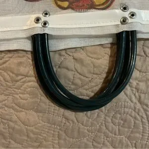 Lightweight mesh tote with vibrant Frida print. Features sturdy double handles and colorful striped trim. Perfect for beach days, shopping, or everyday use. White color adds fresh, versatile style. Purchased in Playa Del Carmen and has Playa Del Carmen printed on back.