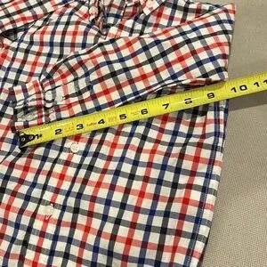 Classic shirt with button-down collar. Features red, blue, black and white checkered pattern.