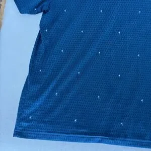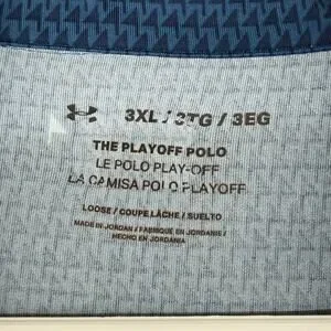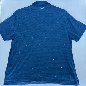 Under Armour Playoff 2.0 Performance Golf Polo in Men's size 3XL. This shirt features a blue geometric pattern with a subtle 4-way stretch for maximum comfort on and off the course. Crafted from a breathable, sweat-wicking blend of 95% polyester and 5% elastane. Features the iconic Under Armour HeatGear technology for a loose, comfortable fit. Good pre-owned condition with no visible stains or snags.