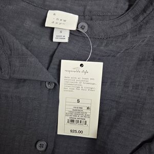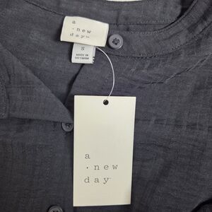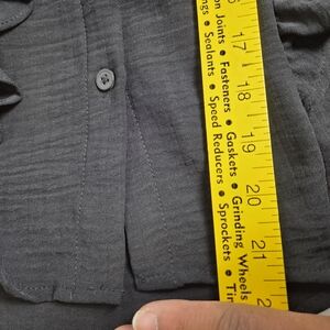 A New Day dark gray button-front top with feminine ruffle trim. Lightweight fabric offers comfortable all-day wear. Versatile styling for work or weekend looks. Features short sleeves and a flattering V-neckline.